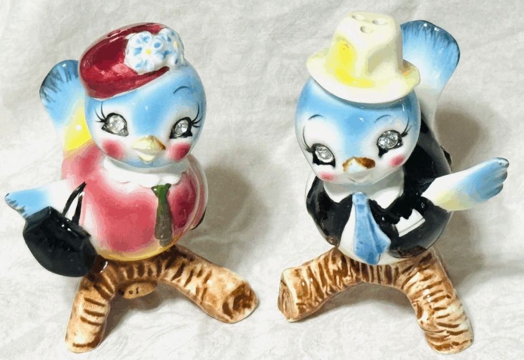 Produced during the 1950s, Napco’s Bluebird Salt and Pepper Shakers were part of the brand’s popular bird-themed line. These ceramic pieces featured soft blue hues and gentle facial expressions. Their cheerful design added charm to kitchen tables and collections alike. Each pair was hand-painted and finished with a light glaze for shine. Sets in mint condition can bring $60 to $120.