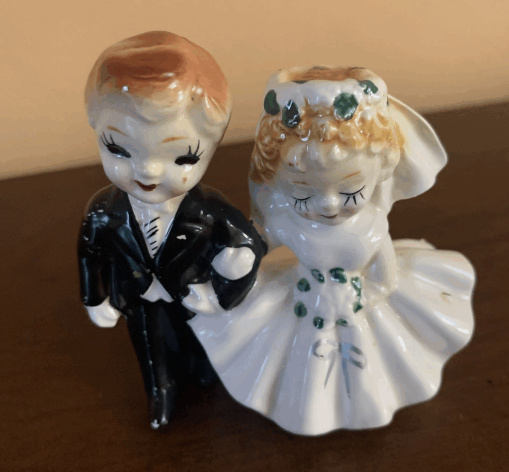 Napco introduced their porcelain Bride and Groom figurines during the 1950s as popular wedding gifts. Each set showcased fine detailing, from the lace texture on the bride’s gown to the groom’s formal attire. Their hand-painted features and smooth glaze reflected the brand’s quality craftsmanship. The romantic design symbolized love and celebration in a timeless way. Sets typically sell for $80 to $200 depending on condition.
