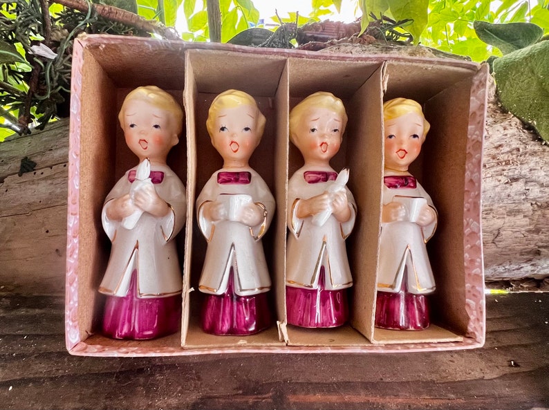 Collectors appreciate these Choir Boys for their nostalgic connection to mid-century Christmas decor. They are often displayed alongside Napco Angels or ceramic trees. The Napco Japan label confirms their authenticity and craftsmanship. Their cheerful faces make them a heartwarming addition to vintage holiday collections. These figurines still capture the innocence and joy of the season.