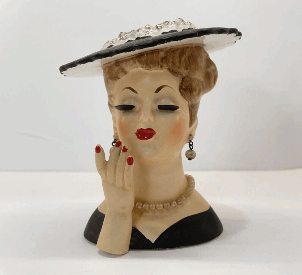 Napco’s Lady Head Vases appeared in the early 1950s and symbolized elegance and grace. Made from fine ceramic, these vases featured women’s faces with detailed hairstyles, jewelry, and expressive eyes. Many designs reflected Hollywood glamour and 1950s fashion trends. Collectors adore the subtle blush tones and smooth porcelain finish. Prices range from $75 for small models to over $500 for rare versions with intact earrings and pearls.