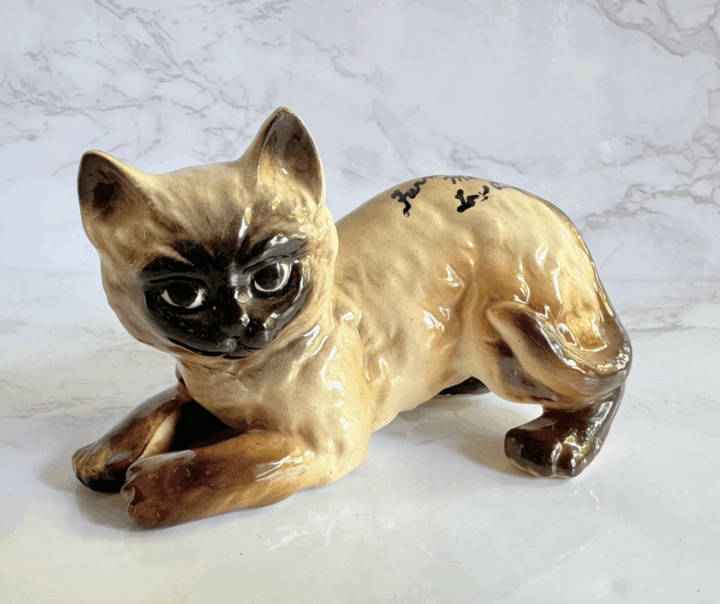 Norcrest Cat figurines became popular in the early 1960s, known for their expressive eyes and elegant forms. Made of porcelain with a glossy finish, they often featured painted collars and bows. Some cats were playful, while others had a sleek, regal stance. Their hand-painted details captured feline charm perfectly. Depending on design, their value ranges from $75 to $180.