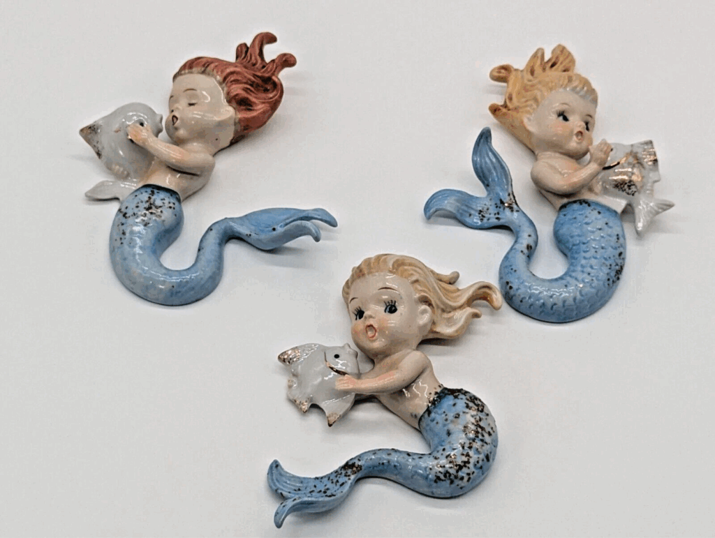Collectors prize these mermaid plaques for their whimsical charm and nostalgic flair. Their rarity has grown as fewer intact pieces remain available. Many sets came in pastel colors like aqua and coral, adding to their visual appeal. The Norcrest stamp and original wall hooks increase value significantly. They remain one of the most recognizable and cherished designs among Norcrest fans.