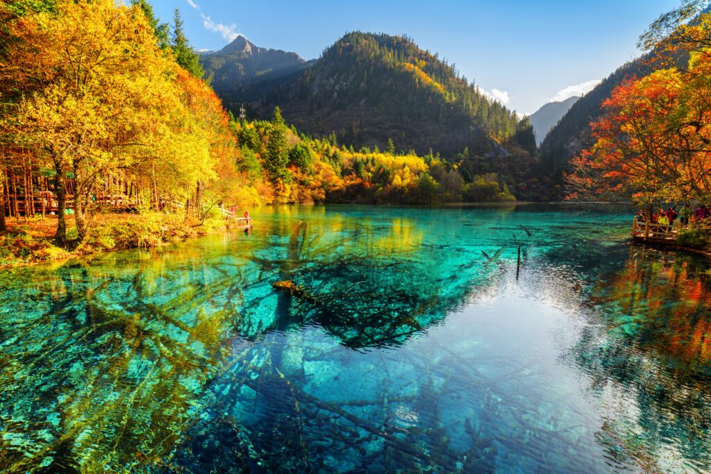 Jiuzhaigou is a UNESCO World Heritage Site known for its colorful lakes and waterfalls. In autumn, the surrounding forests burst with reds, yellows, and oranges that reflect beautifully in the turquoise waters. The valley feels like a living painting during this season.