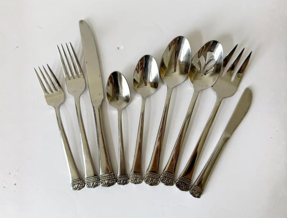 This old school set of picnic forks and spoons by Oneida has timeless, simple lines that appeal to collectors. The weight and balance of each piece feel familiar from childhood gatherings. They are made from stainless steel with classic handle shapes that feel comfortable to hold. A full set in good shape can sell for $20 to $50.