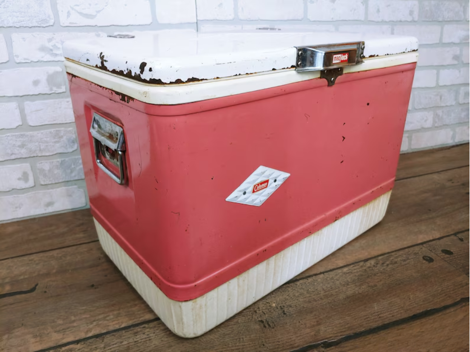 This retro cooler by Coleman brings a nostalgic feel with its metal body and simple latch design. Longtime fans of outdoor eating enjoy it for its reliability and retro styling. The cooler is made from thick aluminum with foam insulation inside to slow melting. A decent example can be worth around $60 to $130 to the right buyer.