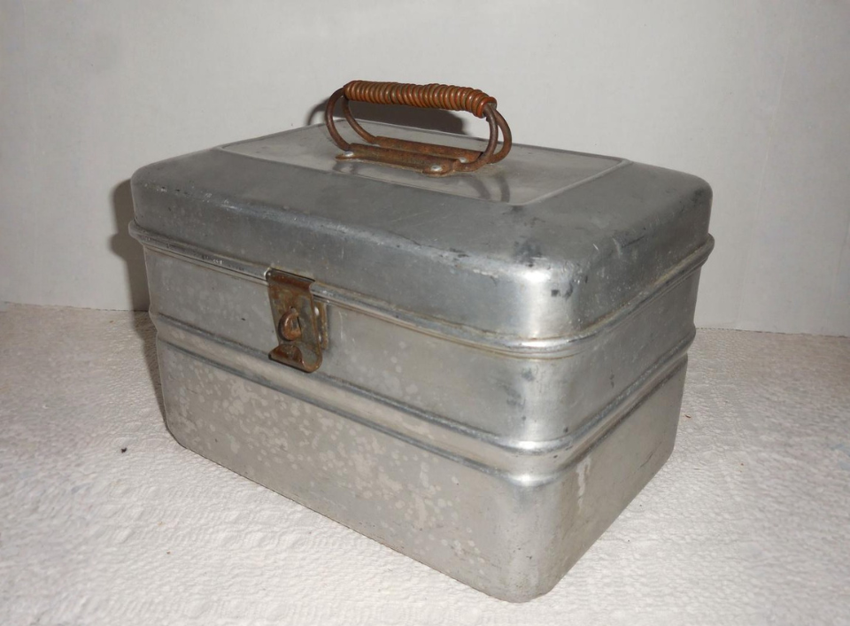 Collectors are drawn to the simple latch and polished finish that shine in the sunlight of this retro aluminum food carrier. The food carrier by Wear Ever has stackable pans that keep dishes warm and easy to carry. It is made from lightweight aluminum with handles that fold down for travel. A set in decent shape can bring about $50 to $100.