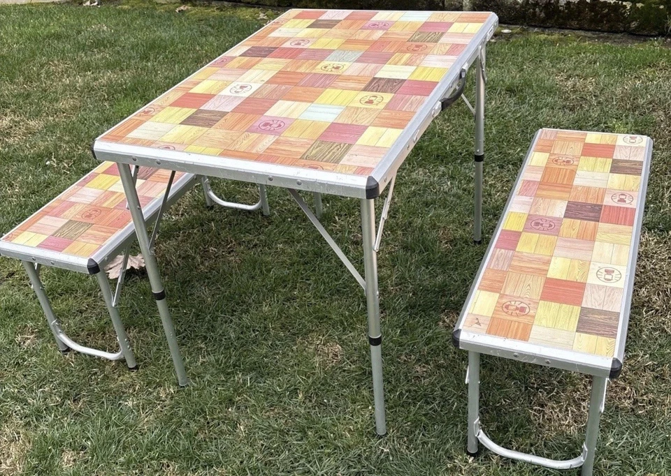 This fold-up picnic table from Coleman is a practical and nostalgic piece that many outdoor lovers seek. It has a compact design that opens into a small table and bench setup without much effort. The frame is made from steel, and the top boards from wood that has aged with use. A clean and working table can sell for $100 to $250.