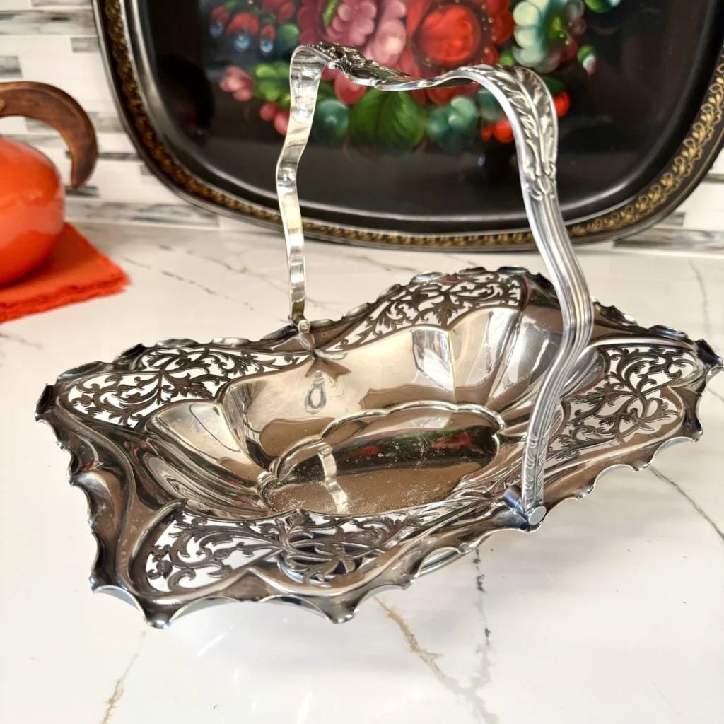 If the basket has a liner, check the liner size and shape because replacements can be annoying to find. Pierced designs can trap dust and tarnish, so run a fingertip along the cutouts to see how much grime is sitting in there. A gentle cleaning can make a big difference, but heavy polishing can round off crisp details, so go easy if you plan to shine it up. Clear stamps plus an attractive pierced pattern are usually what makes one worth buying.
