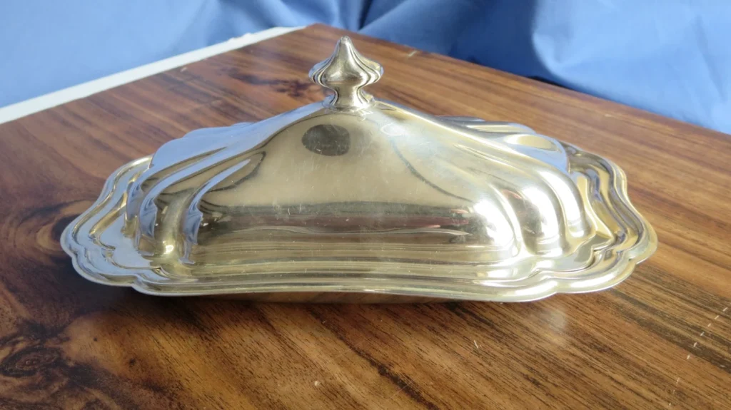 Butter dishes are great to check because they are small, common, and often marked clearly on the base. Flip it over and look for a maker name, symbol, or a plating designation, then check the underside of the lid as well. Many butter dishes have a glass insert, and those can crack or go missing, so confirm what the piece is supposed to include. A clean edge and a lid that sits straight make a big difference in how it looks on a counter.