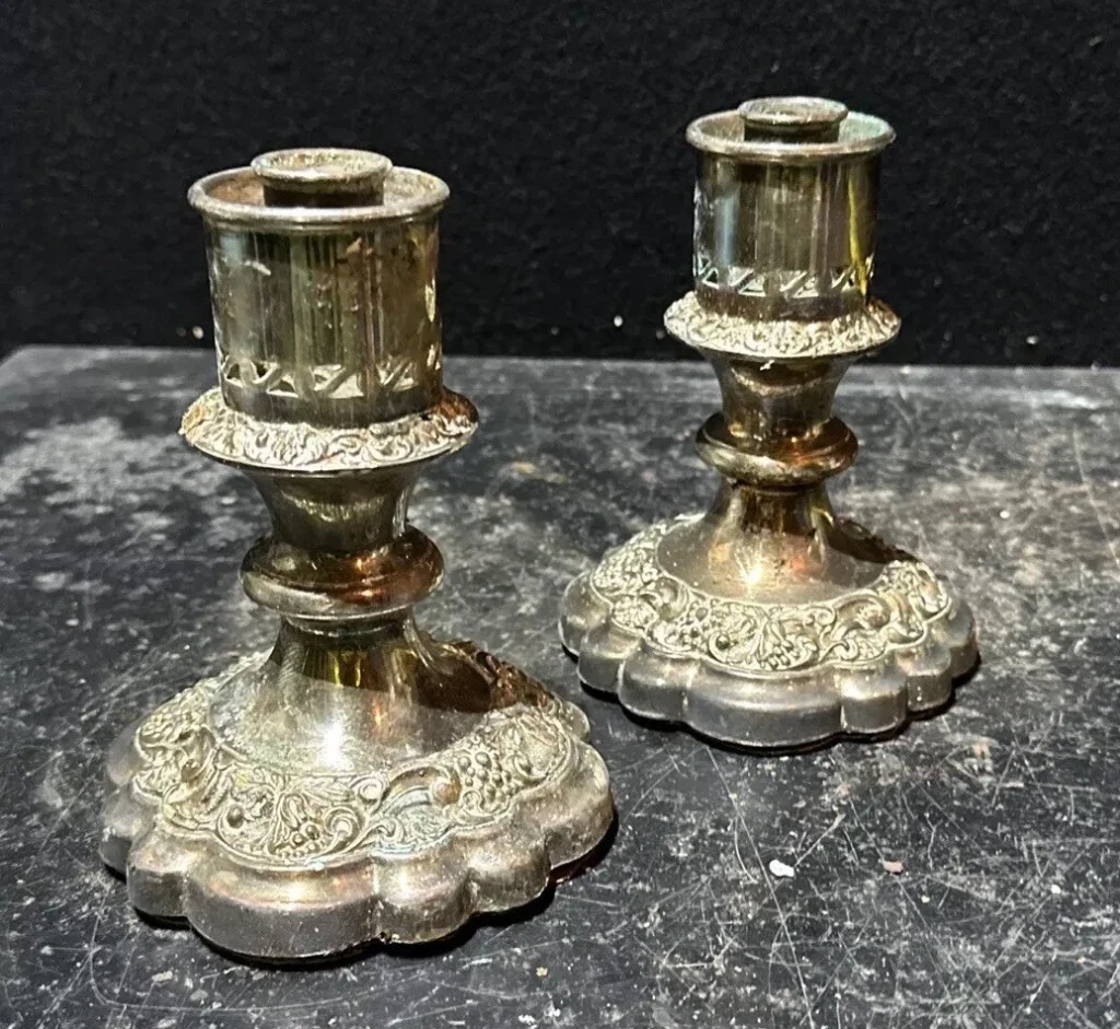 Silverplate candlesticks are a smart hallmark check because bases often carry a maker stamp, a number, or a country mark. Look under the felt or fabric on the bottom, since stamps are sometimes hidden there, and be ready for the felt to be missing on older ones. Many candlesticks are filled with plaster or cement for weight, so do a gentle shake to see if anything rattles inside. A matched pair with the same stamp and similar wear is usually more appealing than two singles.