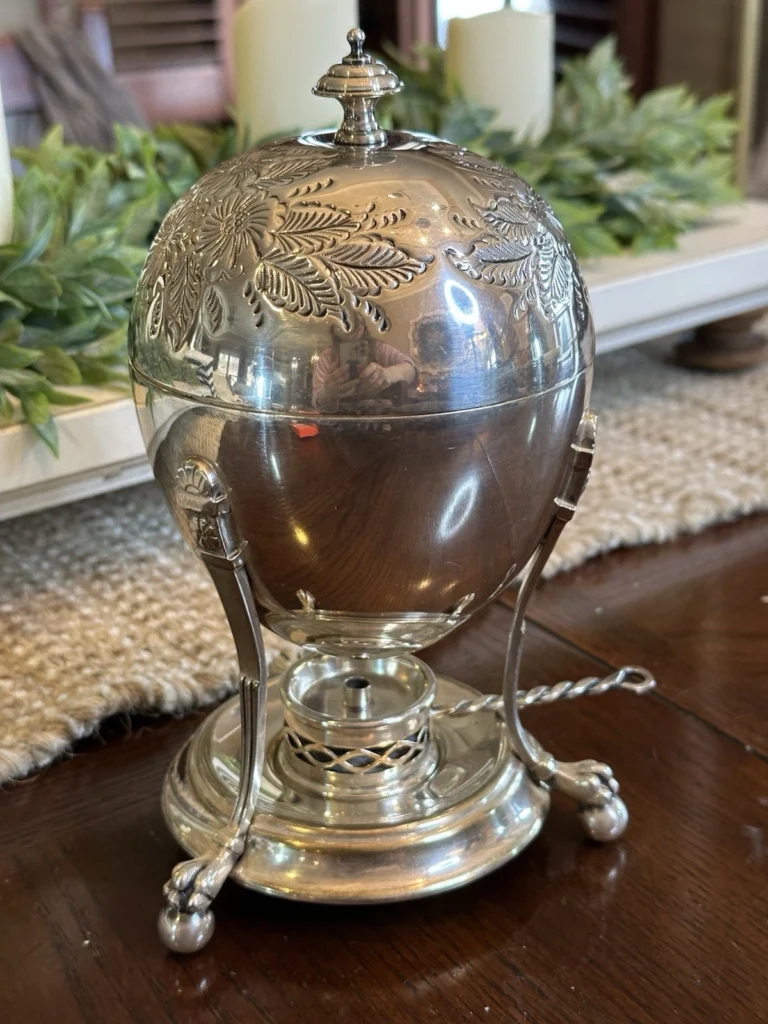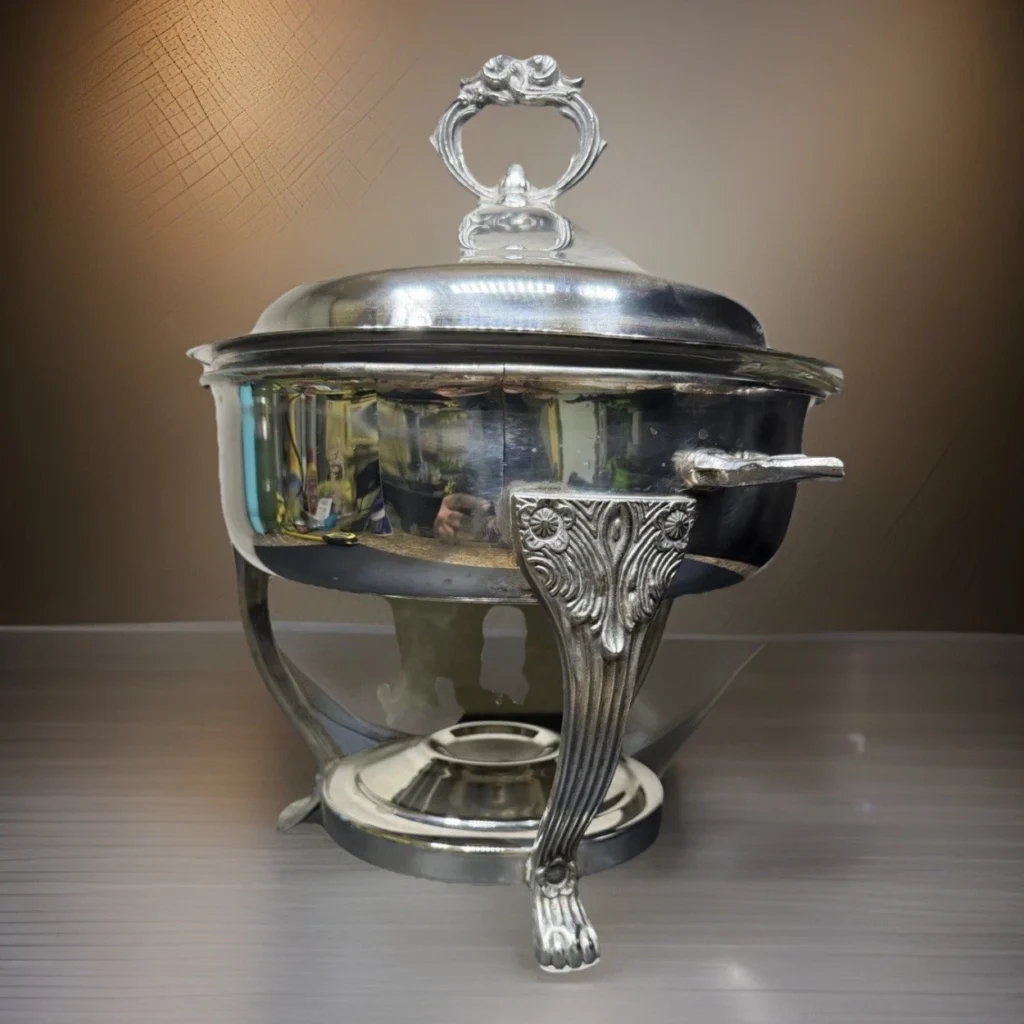 If the chafing dish has a burner, inspect it for dents and check that any cap or snuffer still fits. Missing parts are common, so a quick count of what is there can keep you from buying a project you did not want. Light surface tarnish is fine, but deep dark spotting can mean the plating is thin in those areas. When you find a clear maker stamp and the dish feels solid, it can be a surprisingly good pickup.