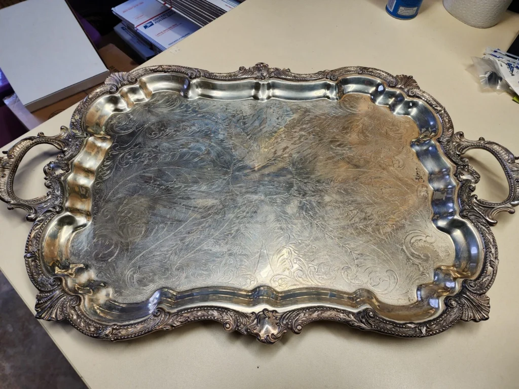 A big Victorian silverplate tray is usually worth flipping over because makers often stamped full names, city marks, and pattern numbers on the back. Look along the rim, near a handle base, or close to the foot ring since those are common spots for marks. These trays can feel heavy for their size, and that weight can hint at better plating and a sturdier base metal. If the surface shows fine scratching and soft shine instead of mirror gloss, it often still cleans up nicely without looking overly new.
