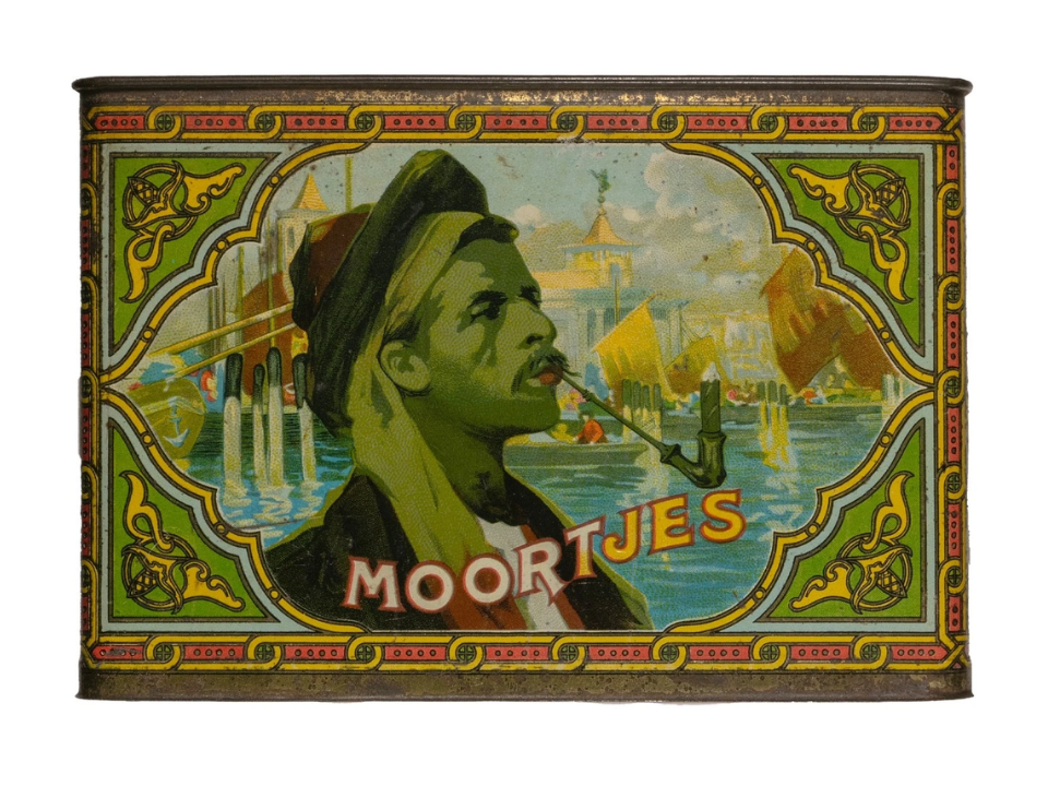 The Moortjes tobacco tin from the Netherlands features colorful lithography that reflects European design trends from the early to mid twentieth century. Its foreign origin makes it an appealing addition for collectors who want their shelves to show variety beyond domestic brands.