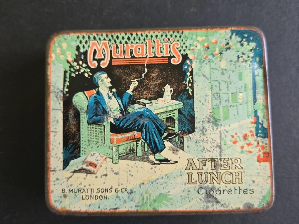 The Muratti “After Lunch” tin is a smaller, elegant piece aimed at smokers who enjoyed a specific blend after meals. The wording on the tin alone gives it charm, since it hints at older social habits around daily smoking routines.