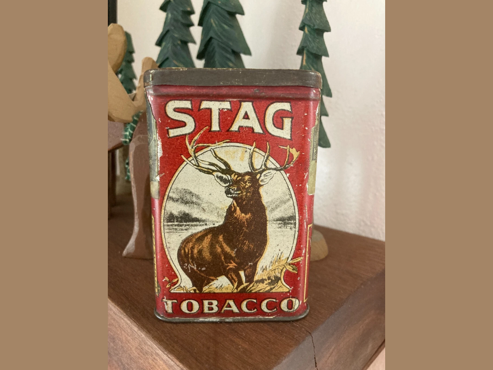 The Stag pocket tobacco tin is a classic vertical tin that shows a proud stag against a rich background, a look that many collectors recognize right away. Most examples date from the mid twentieth century, and many show gentle wear from years spent in pockets or on shop counters, which adds to their charm.