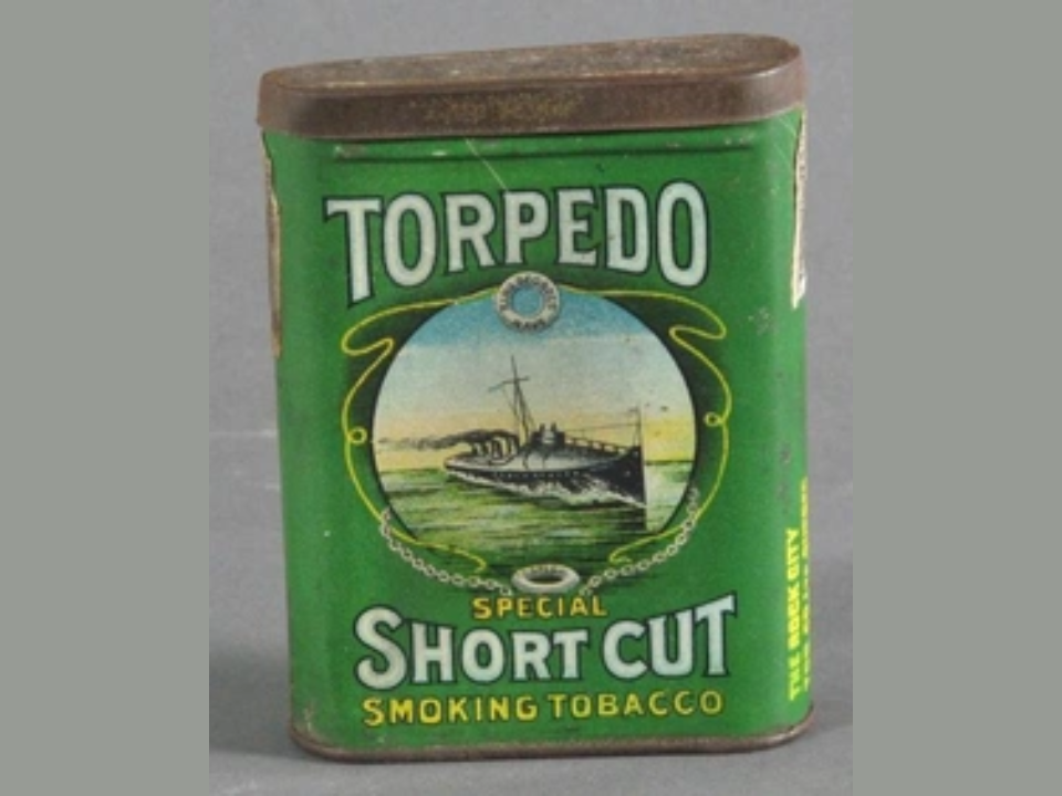 The Torpedo Short Cut tobacco tin is well known for its naval imagery, often featuring a ship charging ahead across the front panel. This dramatic scene makes it a standout piece that looks powerful in any tobacciana grouping.