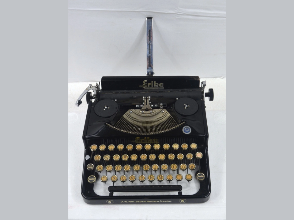 The Erika Model 5 from Seidel and Naumann in Germany has become a favorite among collectors who enjoy prewar European standards and portables. Made in the 1930s and 1940s, it often features glossy black paint, glass keytops, and a compact yet solid frame that looks elegant on a desk. Collectors talk about the smooth typing feel and the sense of quality that comes from the well finished metal parts and neatly printed key legends.