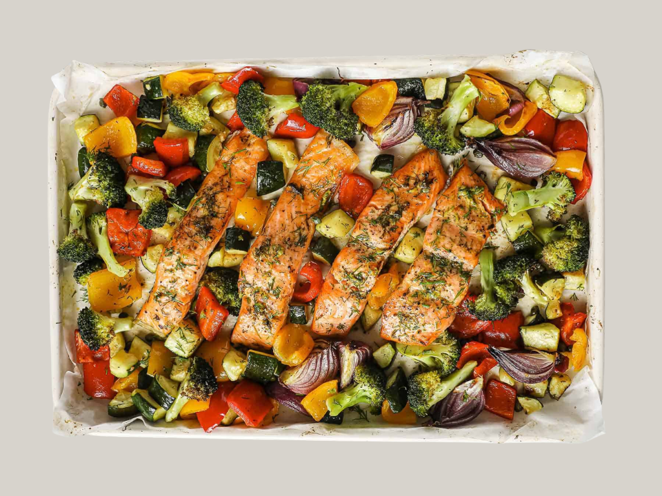 You’ll need 2 salmon fillets, 1 zucchini sliced into rounds, 1 bell pepper sliced, 1 tablespoon olive oil, 1 teaspoon lemon zest, salt, and pepper to taste. Preheat the oven to 400 degrees Fahrenheit (200 degrees Celsius). Place the salmon fillets on a baking sheet and arrange the sliced zucchini and bell pepper around them. Drizzle olive oil over the salmon and vegetables, and sprinkle lemon zest, salt, and pepper. Bake for 15-20 minutes until the salmon is fully cooked and the vegetables are tender. Garnish with lemon slices and serve immediately.