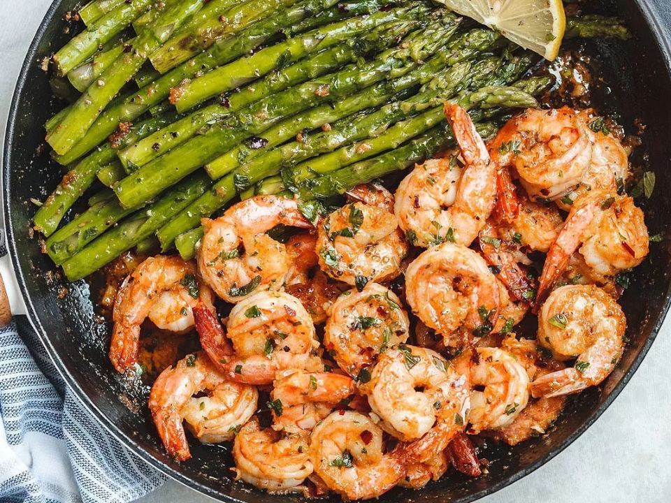 For this meal, you will need 1 lb of shrimp peeled and deveined, 1 bunch of asparagus trimmed, 2 tablespoons butter, 3 cloves of garlic minced, one-fourth cup grated parmesan cheese, and salt and pepper to taste. Melt the butter in a large pan over medium heat, then sauté the garlic for 1-2 minutes. Add the shrimp and asparagus to the pan and cook for 5-7 minutes, stirring occasionally, until the shrimp are pink and the asparagus is tender. Sprinkle with parmesan cheese and serve immediately for a delicious, easy meal.