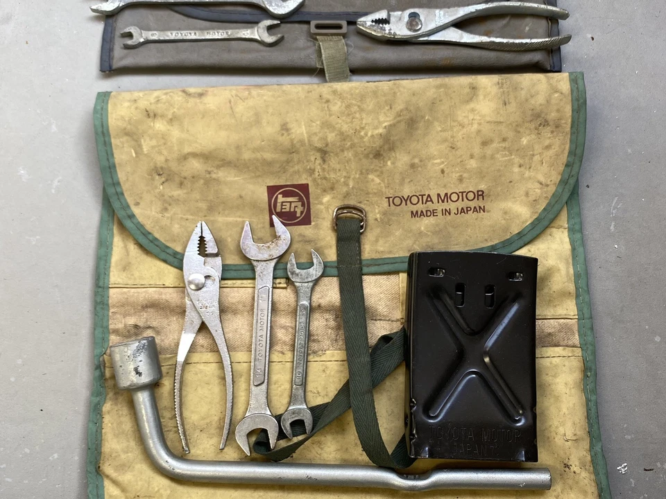 This Toyota tool roll from 1974 came with first generation compact pickups and had a simple roll design. Today, these are hard to locate since many were lost or discarded. Good sets on sale fetch $300 to $500 with interest from collectors of Japanese vehicles. The cloth roll shows the original Toyota logo, which is a sign of its age. Some come with old receipts showing original purchase, which adds a story.