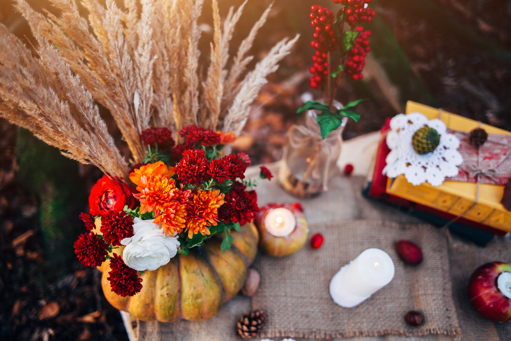 Repurpose your fall floral arrangements by adding a spooky twist with a pumpkin base. Take a medium-sized pumpkin and scoop out the insides, replacing them with a floral arrangement of dark, moody flowers such as black dahlias or deep red roses. For added effect, you can use mini LED candles inside the pumpkin to illuminate the arrangement, making it glow with a ghostly light. This combination of pumpkins and dark florals creates an eerie, elegant Halloween decoration that adds charm to your porch or front door.