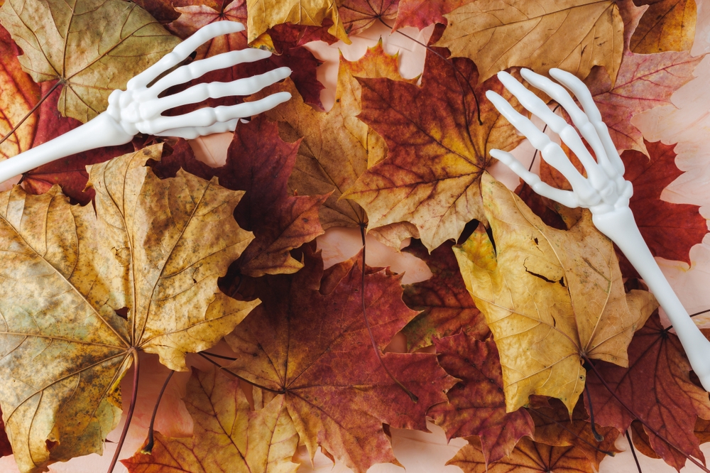 Skeletons are a staple in Halloween decor, and they pair surprisingly well with fall elements. To bring them into your outdoor decor, begin by scattering skeleton pieces among the fallen autumn leaves or near your hay bales. Whether you use full-size skeletons or smaller parts like skulls, the contrast of the light bone color with the rich colors of the fall leaves is striking. You can also pose the skeletons in playful or spooky positions, such as sitting on a hay bale or hanging from a tree branch.