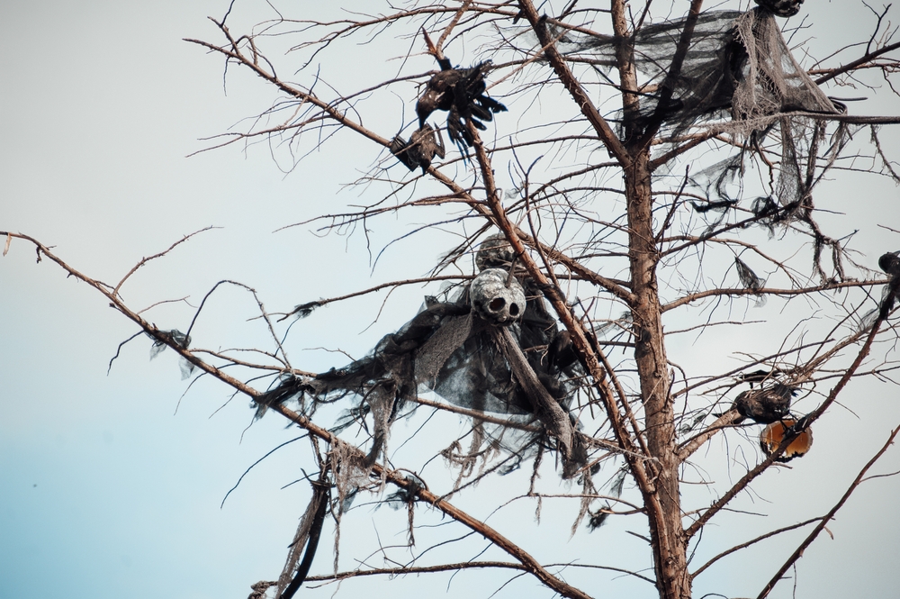 Tree branches are an excellent element in both fall and Halloween decor, and they provide a versatile foundation for spooky accents. Begin by using bare or leafless tree branches in your fall display, perhaps arranged in a vase or woven through a fence. As Halloween draws near, add creepy, glowing eyes or hanging bats from the branches, or drape them in faux spider webs. You can even install some colored lights along the branches for a creepy, glowing effect that gives your yard a haunted feel.