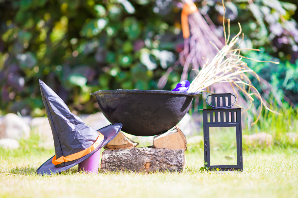 Witch-themed decor can easily transition your lawn from fall to Halloween. Start by using classic fall lawn elements, like hay bales and autumn-colored leaves, and add a witch’s hat or broom leaning against them. You can create a little “witch’s corner” by placing a faux cauldron, a broomstick, or even a spooky witch’s silhouette near your porch or at the edge of the yard. If you have a standing skeleton or scarecrow, donning a witch’s hat and accessories will make it fit seamlessly into the Halloween theme.