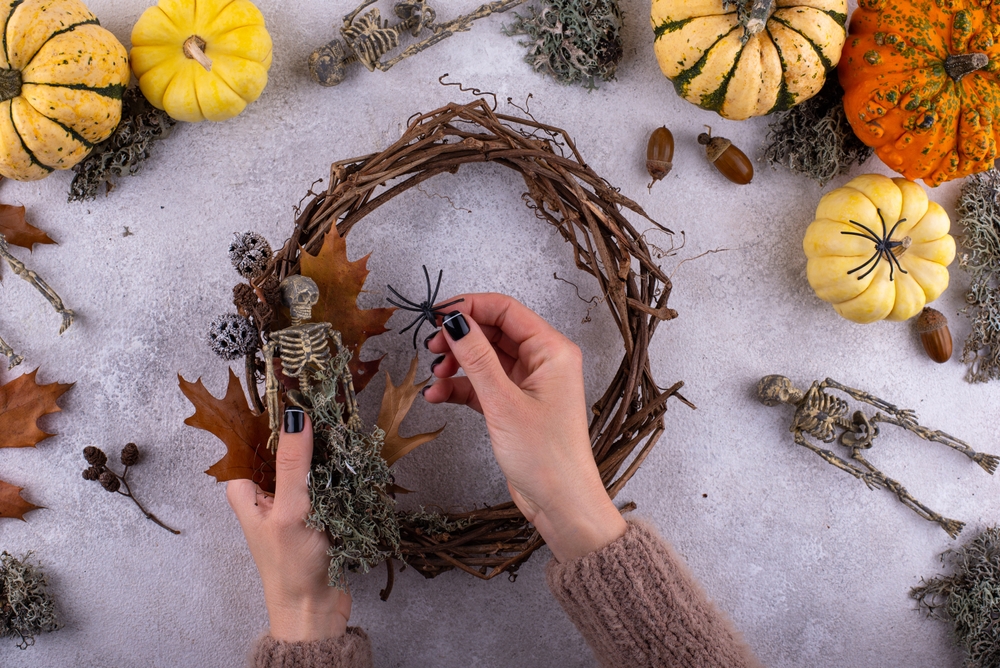 Maintaining the structure of a fall wreath allows it to transition smoothly, and with just a few added pieces, you can create a spooky focal point for your front door. Layering festive elements over the wreath’s base can keep it in line with autumn, while adding just enough Halloween spirit to match the tone of the season. A wreath like this is a great way to greet guests with a mix of warm fall vibes and playful Halloween energy.