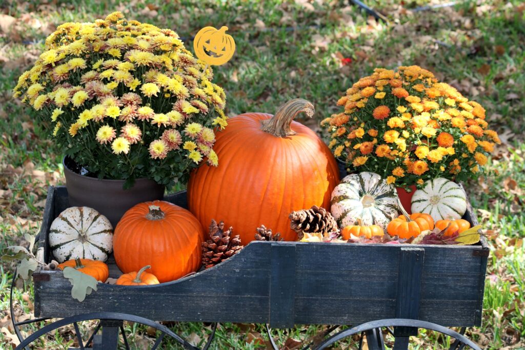 A vintage-style wheelbarrow planter can make a charming addition to any outdoor space. Fill the wheelbarrow with bright mums and scatter pumpkins of varying sizes around the base. The rustic look of a wheelbarrow adds a timeless feel to your fall garden décor. Place it at the end of a garden path or near the front door for maximum impact.