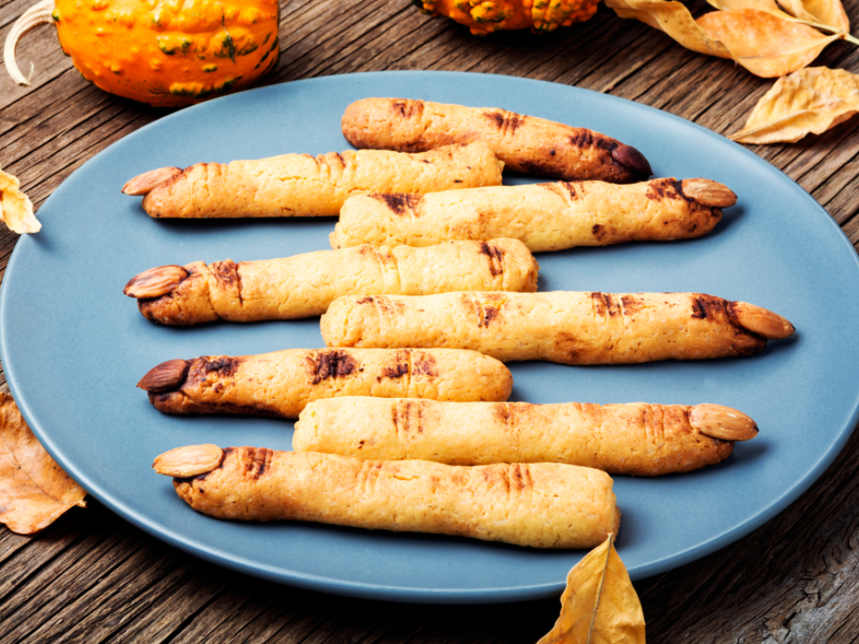 To make the dough, combine 2 3/4 cups flour, 1 cup butter, 1 1/2 cups sugar, 2 eggs, and vanilla extract. Mix until smooth, then roll the dough into finger shapes. Press an almond into the tip of each cookie to create the “nail.” Bake at 350°F for 12-15 minutes, or until golden. Once cooled, use red food coloring gel to add blood details around the almond. Serve these spooky cookies to guests for a Halloween scare.