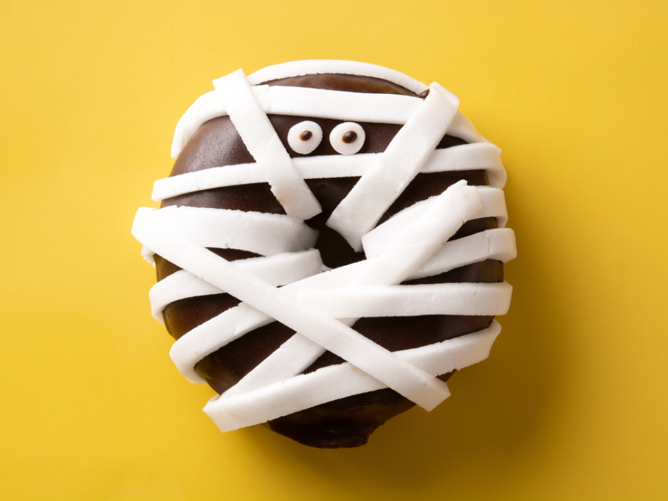 Use 12 mini donuts. Drizzle with 1 cup melted white chocolate or white frosting, leaving gaps for the eyes. Place two candy eyes on each donut. Let the frosting set for 10 minutes. These quick, spooky treats are perfect for any Halloween gathering.