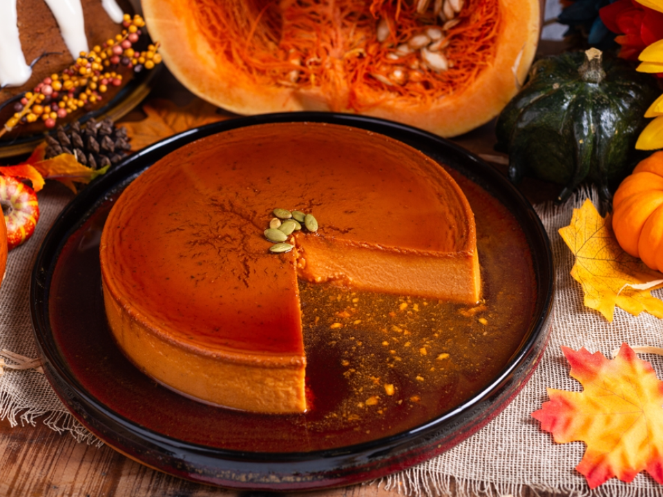 For the caramel, melt 1 cup sugar in a saucepan over medium heat until golden. Pour the melted caramel into a flan dish and set it aside. For the flan, whisk together 1 cup pumpkin puree, 3 eggs, 1/2 cup sugar, 1/2 teaspoon cinnamon, and 1/4 teaspoon nutmeg. Pour the mixture over the caramel and bake in a water bath at 350°F for 45 minutes. Let it cool before flipping onto a serving plate to reveal the caramel glaze. Serve this decadent dessert to add an elegant Halloween touch to your table.