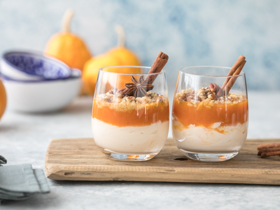 Combine 1 1/2 cups crushed graham crackers with 1/4 cup melted butter and 2 tablespoons sugar. Press into the bottoms of clear glasses. Mix 1 cup canned pumpkin, 1/2 cup heavy cream, 1/4 cup brown sugar, 1 teaspoon cinnamon, and 1/4 teaspoon nutmeg until smooth. Layer pumpkin mixture over graham cracker crust, then top with whipped cream. Chill for at least 2 hours before serving.
