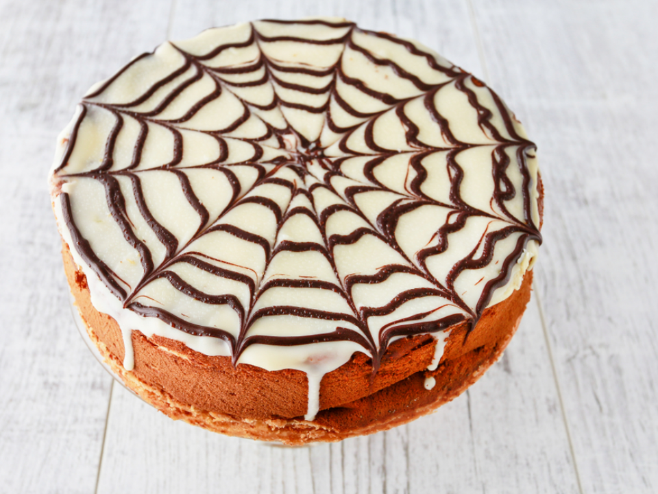 To make this cake, bake two 8-inch chocolate cake layers at 350°F for 30 minutes or until a toothpick comes out clean. Let the cakes cool completely. Spread 1 cup of chocolate buttercream between the layers and on top. Using black icing in a piping bag, pipe concentric circles starting from the center. Use a toothpick to drag lines from the center outward to create the web. Decorate with small plastic spiders and serve once the icing has set.