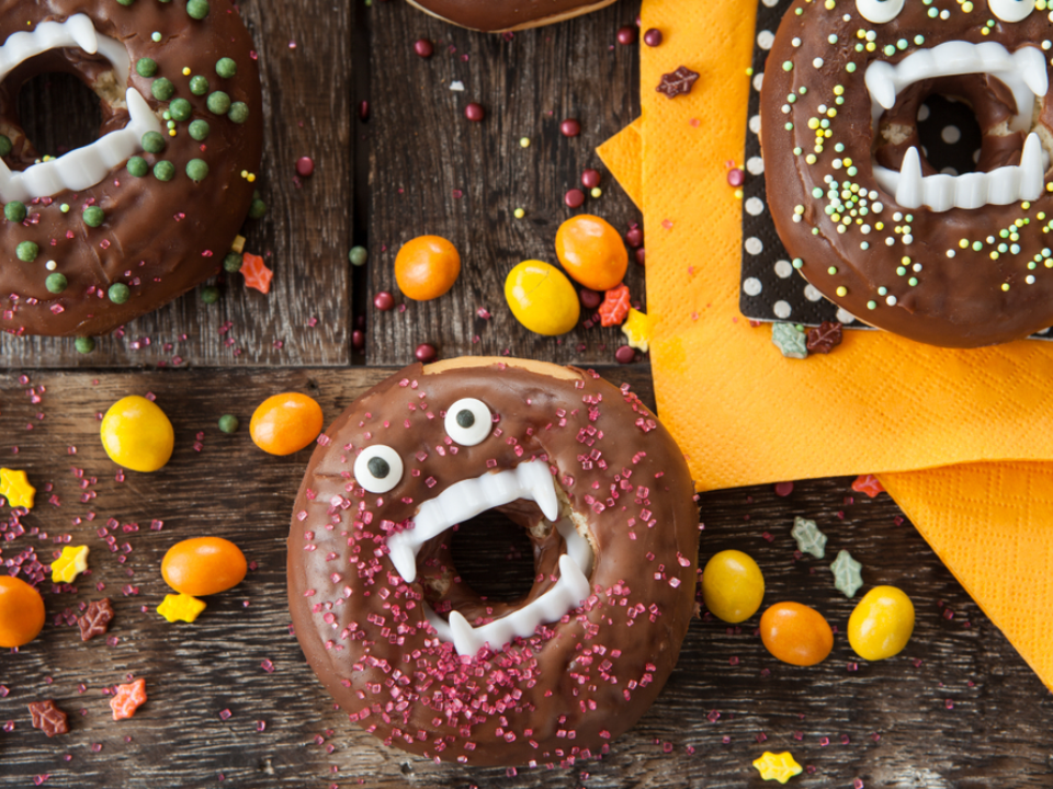 Prepare donuts using a donut pan or deep fryer. Once cooled, cut a small slit in each donut and fill it with raspberry jam for the “blood.” Frost the tops of the donuts with white glaze and add candy teeth on top for a vampire effect. Let the glaze set for 10 minutes, then serve. These donuts are a sweet and spooky way to treat your guests.
