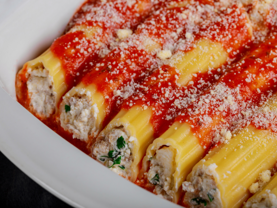 For the filling, you will need 12 manicotti shells, 1 cup of ricotta cheese, 1 cup of spinach (cooked and chopped), 1/2 cup of mozzarella cheese, and 1 egg. Cook the pasta shells and set them aside. Mix the ricotta, spinach, mozzarella, and egg to form the filling. Stuff the shells, place them in a baking dish, cover with marinara sauce, and bake at 375°F for 20 minutes. Serve warm.