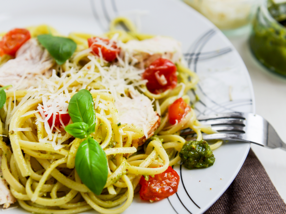 For the recipe, you will need 8 ounces of spaghetti, 2 chicken breasts (cooked and sliced), 1/4 cup of pesto sauce, 1/4 cup of parmesan cheese, and 1 tablespoon of olive oil. Cook the pasta and set aside. In a pan, sauté the chicken slices in olive oil until browned. Toss the cooked pasta with the chicken and pesto sauce, and top with parmesan before serving.