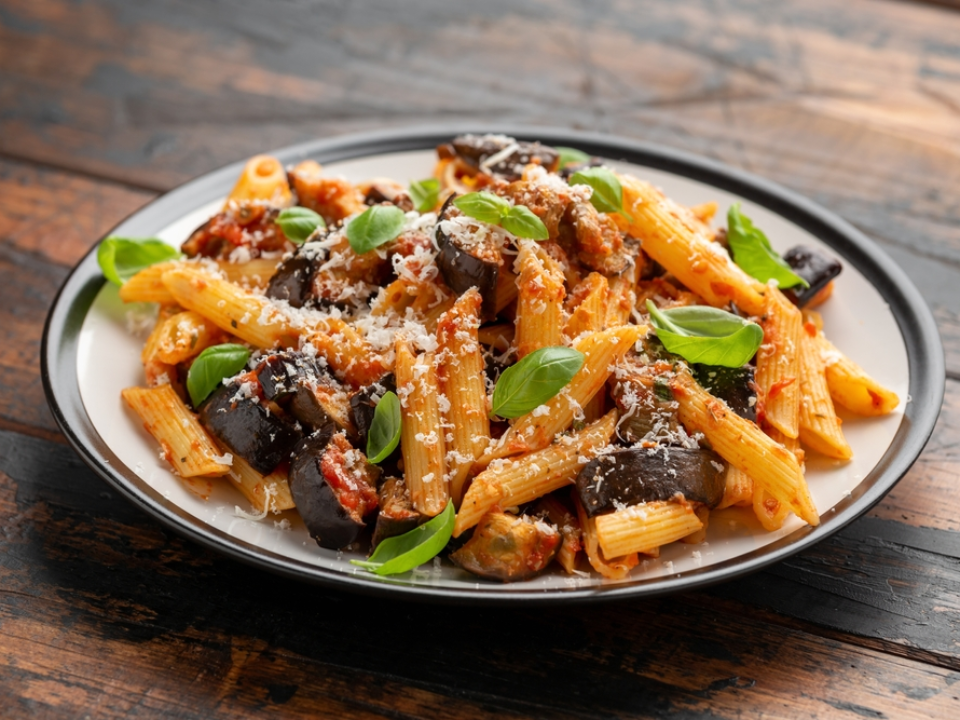 For the recipe, you will need 8 ounces of pasta, 1 eggplant (diced), 1 can of crushed tomatoes, 2 cloves of garlic (minced), 1/4 cup of ricotta salata cheese, and basil leaves for garnish. Roast the eggplant in the oven at 400°F for 20 minutes. In a pan, sauté the garlic, then add the tomatoes and simmer. Toss the pasta with the sauce and roasted eggplant, and top with ricotta salata and fresh basil.