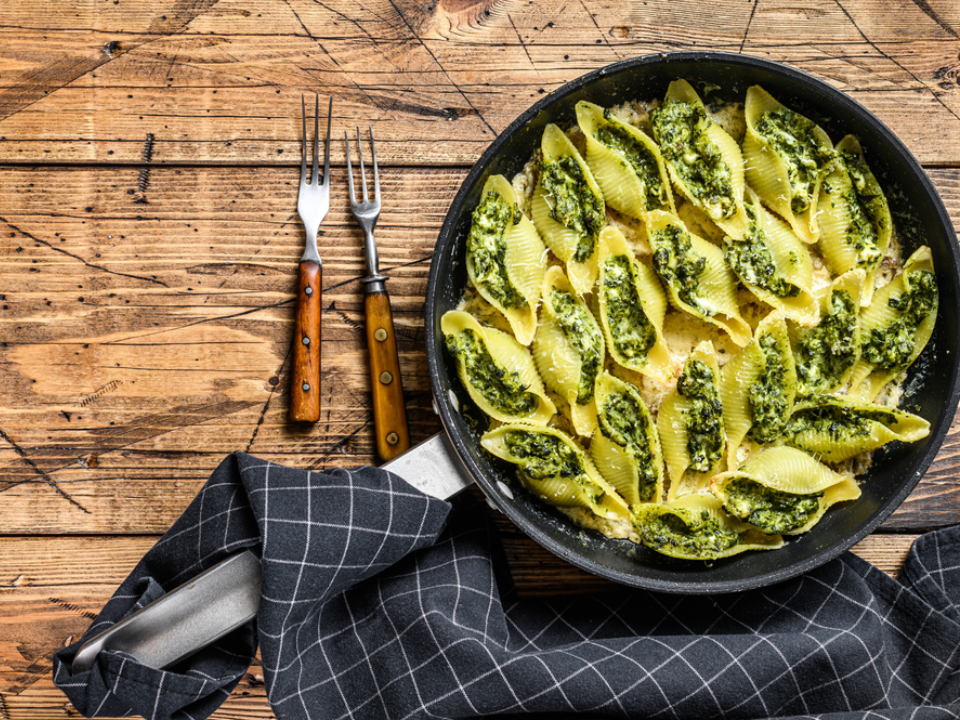 For the filling, you will need 12 jumbo pasta shells, 1 cup of ricotta cheese, 1 cup of spinach (cooked and chopped), 1 cup of mozzarella cheese, and 1 egg. Cook the pasta shells and set aside. Mix the ricotta, spinach, mozzarella, and egg to form the filling. Stuff the shells with the mixture, then place them in a baking dish with marinara sauce. Bake at 375°F for 20 minutes and serve hot.