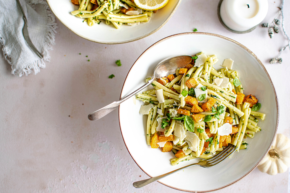 For this recipe, you will need roasted squash, basil, garlic, Parmesan cheese, pecans, and pasta, such as fusilli. Olive oil and lemon juice create the base for the pesto.
