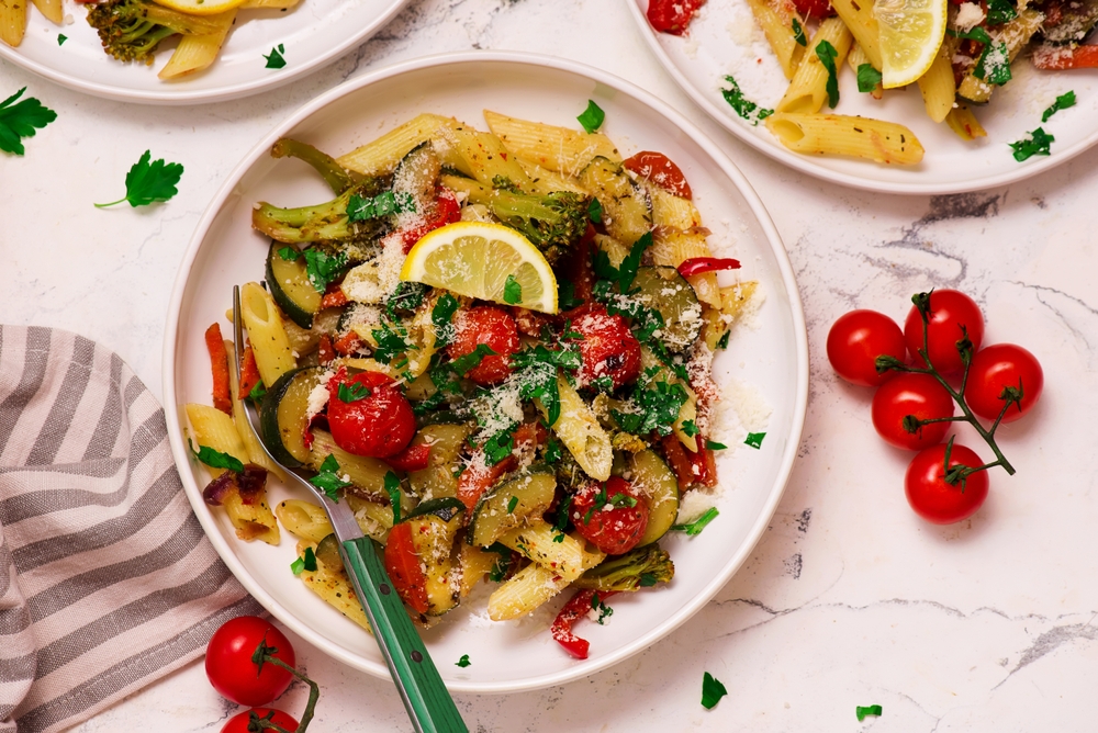 Roast the vegetables with olive oil and garlic until tender. Cook the pasta and toss with the roasted vegetables. Add fresh basil, Parmesan, and a drizzle of balsamic vinegar before serving.