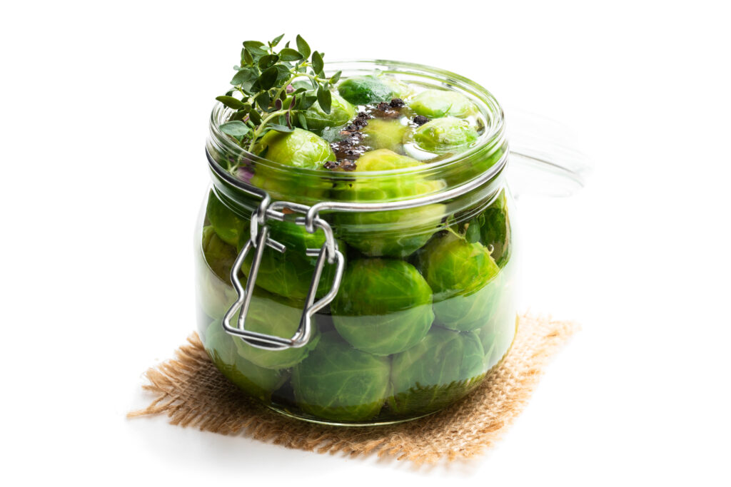 You’ll need 2 pounds Brussels sprouts trimmed, 3 cups white vinegar, 1 cup water, 2 tablespoons salt, 1 teaspoon mustard seed, and 1 teaspoon peppercorns.