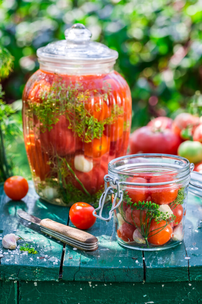 Cherry tomatoes pickle quickly and keep their shape in the jar. Their burst of tangy juice makes them stand out. Garlic and herbs round out the flavor.