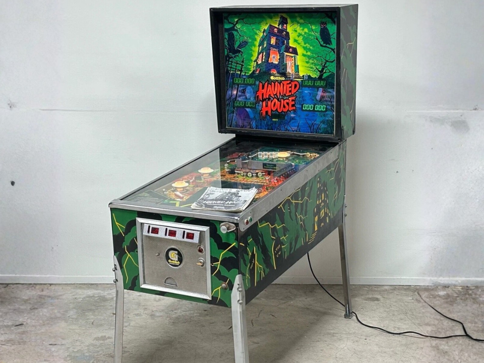 Haunted House was released in 1982 and became famous for its three separate playfields stacked in layers. There is a main level, an attic at the top, and a dungeon below, all linked by trapdoors and scoops that send the ball between floors. Eight flippers and spooky artwork tie the whole haunted mansion theme together. With roughly 6,800 units built and steady collector interest, prices often sit in the $3,400 to $5,500 range.