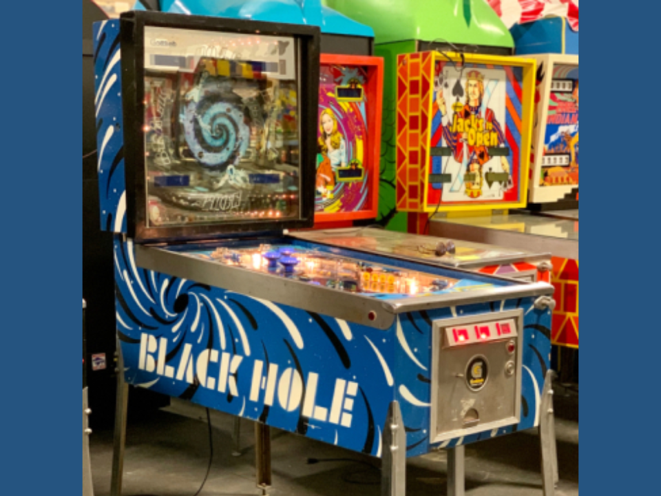 Black Hole arrived in 1981 and surprised players with its dramatic lower playfield that sits behind a window and runs in reverse. Instead of a single surface, the game drops the ball into an underworld section where the flippers are flipped and the ball heads toward the top of the machine. The main field mixes speech, multiball, and mirrored art, so the whole package feels unusual and moody. Around 8,700 units were made, and current values often fall around $2,300 to $3,800 depending on condition.