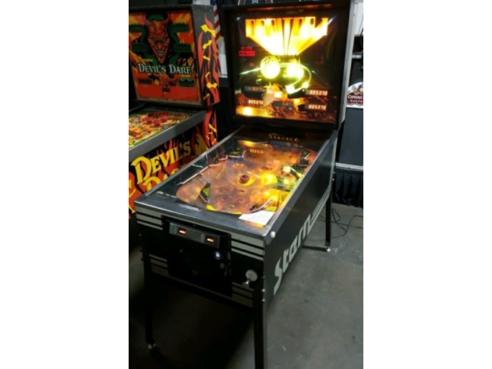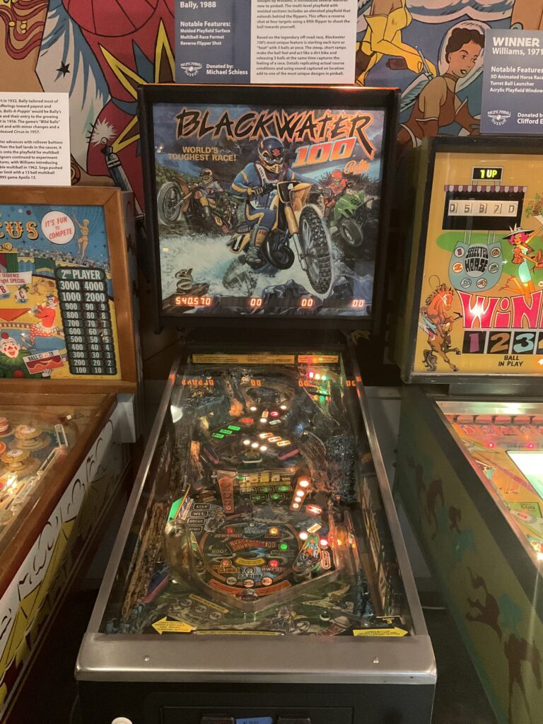 Blackwater 100 came onto the scene in 1988 and turned off road motorcycle racing into a wild multi tier pinball layout. The playfield uses upper sections that act like jumps, staggered ramps, and sudden returns that mimic racing laps. Instead of standard three ball play, you compete in heats, so games have a different tempo and scoring rhythm. About 3,000 units were produced, and many sales land around $3,600 to $4,900 for clean examples.