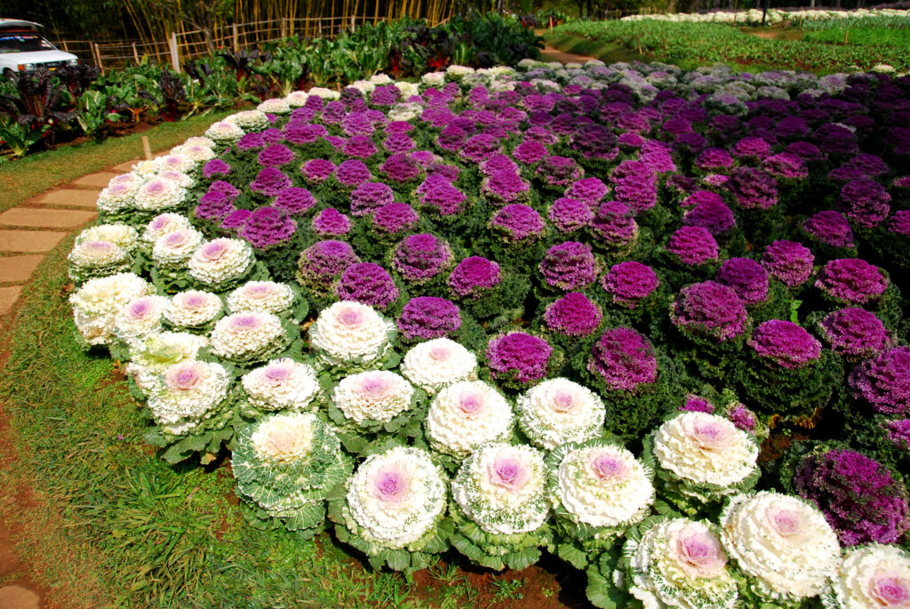 Ornamental cabbage loves cold weather, and the leaf color often looks better after a few frosts. The thick, ruffled leaves hold up in wind far better than tender annuals, especially if the plant is set firmly in the soil. Give it full sun for the best color and plant it in a spot with strong drainage. It can handle cold rain and chilly nights without collapsing.