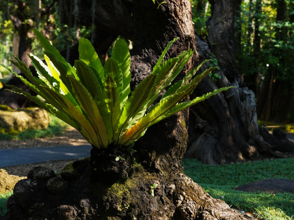 The bird’s nest fern, a non-parasitic fern, is often found growing on tree trunks in tropical forests. This fern uses its tightly curled fronds to form a nest-like shape, from which it gets its name. The fern does not take nutrients from the tree itself but instead relies on the rain, air, and decaying matter that collects in the crevices of the tree bark.
