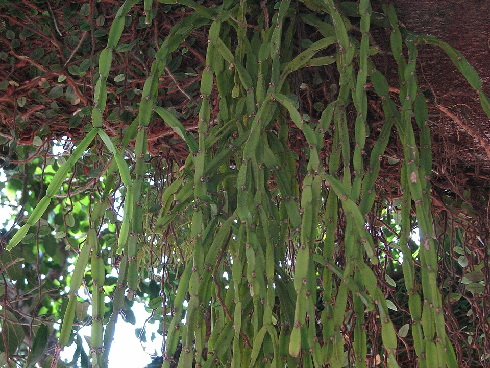 Rhipsalis, commonly known as mistletoe cactus, is an epiphytic cactus species that thrives on other plants without causing harm. This plant grows on the branches of trees, where it absorbs moisture from the air and rain rather than drawing nutrients from the tree itself. Rhipsalis does not damage the host tree because its roots serve only as a means of attachment.